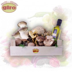 Caja de regalo con un surtido de setas de temporada de cultivo o silvestres, en función de la época. Setas de cardo, colmenilla, rebozuelos, shitake, níscalos champiñon portobello, ideal para un regalo, perretxicos, llanegas,shimeji, completado con una botella de Aceite de trufa. El contenido varía según temporada y se completa con producto para cuadrar el precio final. Se presenta con una composición para regalo y se entrega en la dirección que se indique, incluidos Hospitales, Empresas y Hoteles