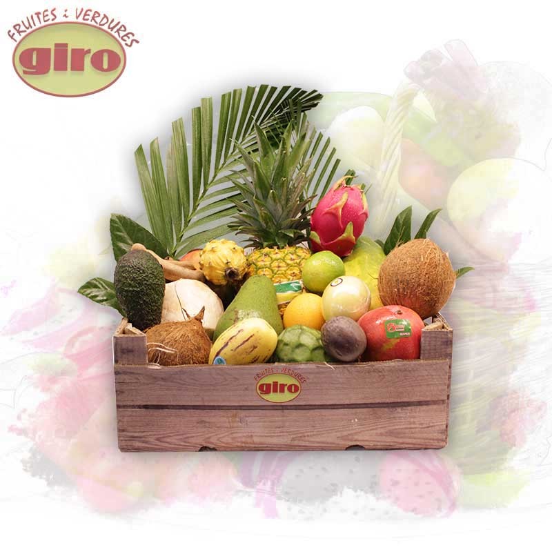 Caja de regalo con un surtido de frutas exóticas y tropicales, en función de la época. Fruta de la pasión, Pitahaya, Fruta del dragón, Piña tropical, Mango, Guayaba, Coco , Lulo, Coco fresco, Granadilla, Logan. El contenido varía según temporada y se completa con producto para cuadrar el precio final.