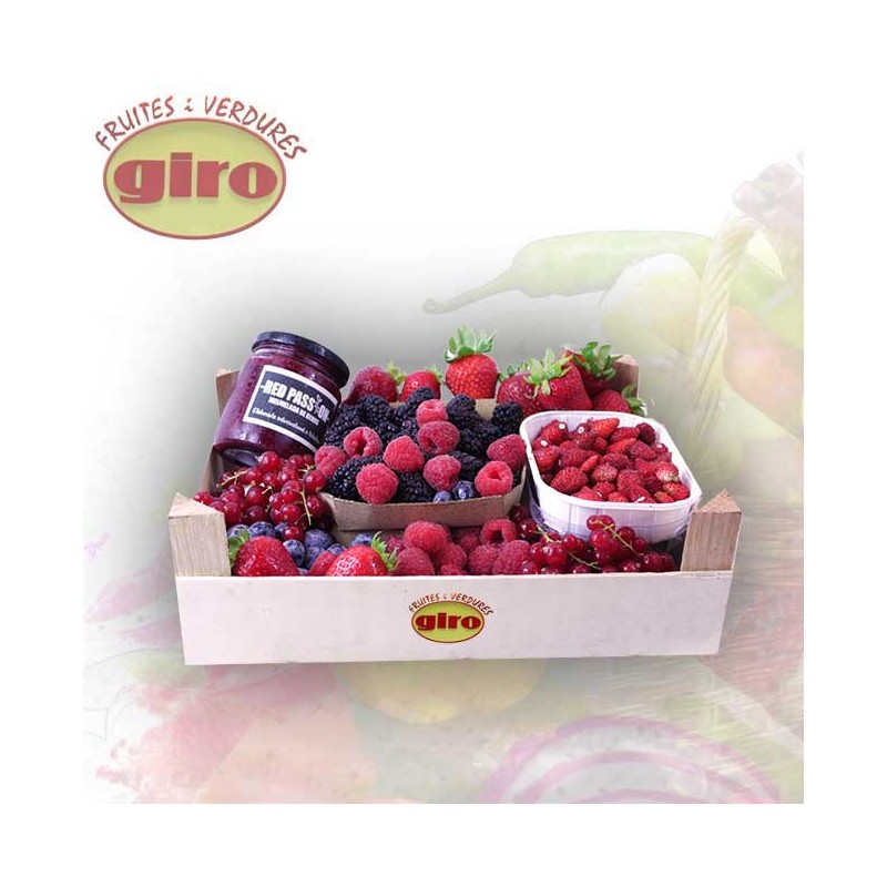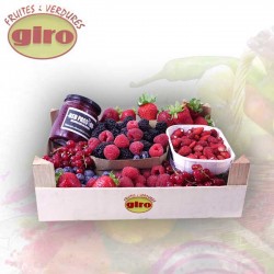Caja de regalo con un surtido de frutas del bosque también conocido como frutos rojos exóticas, en función de la época del año. Compuesta por frambuesas, grosellas, fresas, fresones, fresas silvestres, moras, arándanos, complementada por un Frasco de mermelada de Frambuesa. El contenido varía según temporada y se completa con producto para cuadrar el precio final.
