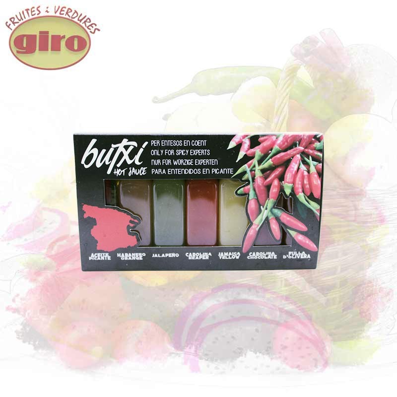 Caja con siete botellines de 20ml de Salsa picantes variadas 1 HABANERO ORANGE, 1 CAROLINA REAPER, 2 JALAPEÑO, 1 FULLA D’OLIVERA, 1JAMAICA YELLOW, 1 CHOCOLATE CAROLINA