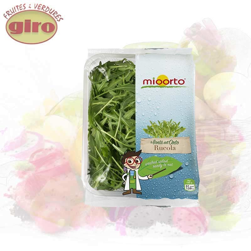 Rúcula fresca de primera calidad envasada, De sabor ligeramente picante y amargo, va mejor en ensaladas, aunque puede cocinarse salteada o sustituyendo a la albahaca en el pesto, entre otras opciones,