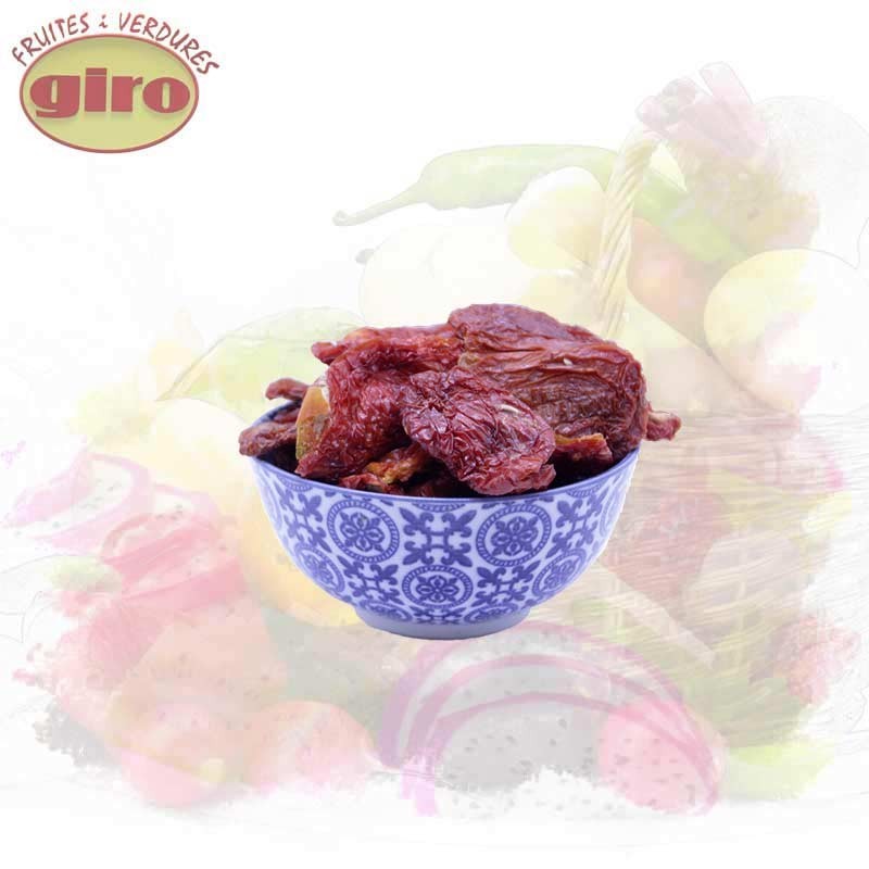 Tomate de primera calidad secado al sol, de sabor intensificado, utilizándose como condimento o guarnición para acompañar platos de carne o ensaladas, salsas, o molido en patés,